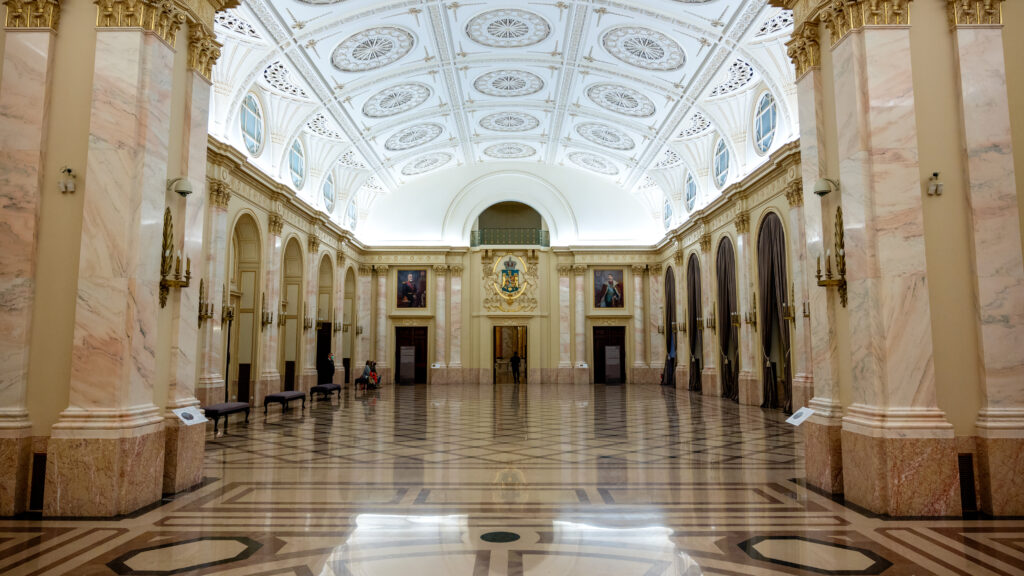 Interior of The National Art Museum in Bucharest, Romania. Golden details, marble, painting