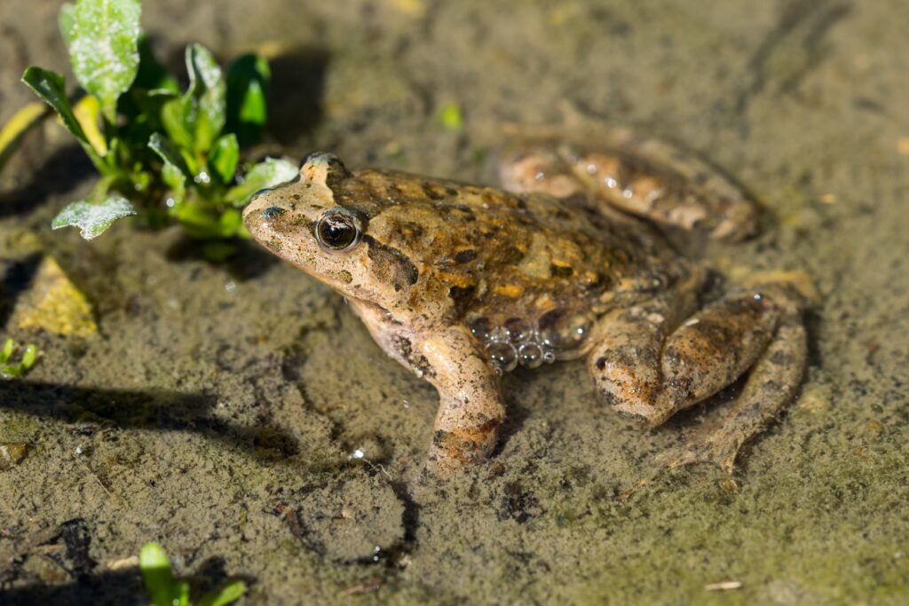 A Mediterranean Painted Frog, Discoglossus pictus, in a water pond in a Maltese valley, Malta