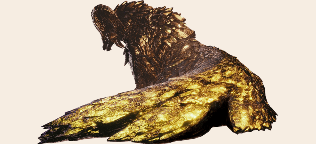 The ego of an emperor and the cruelty of the Queen of Hearts comes Kulve Taroth, fully dressed in the purest gold. A total Diva. Those horns never came with innocent intentions. With her dark skin and the impossibility of killing such a Queen, we can only toe the line with the leftovers of her clothes: that Aureus cloak.